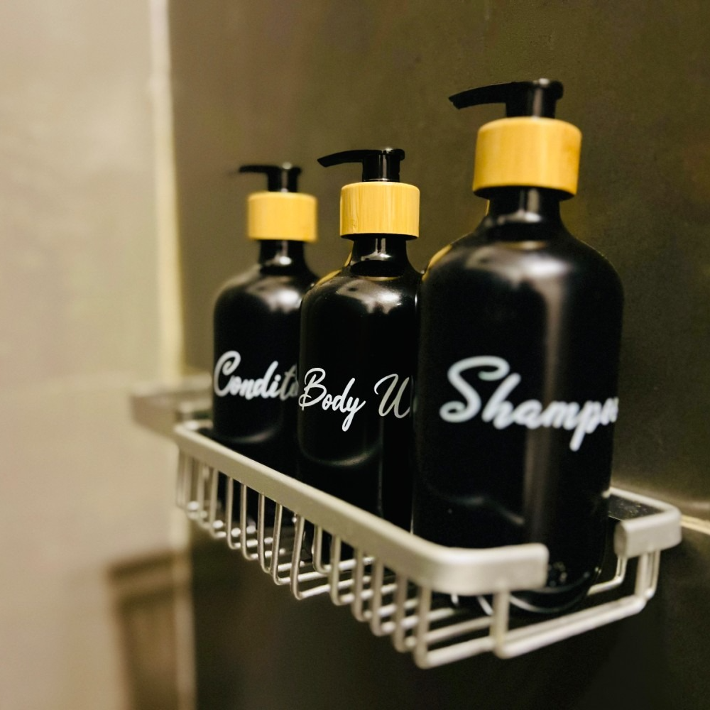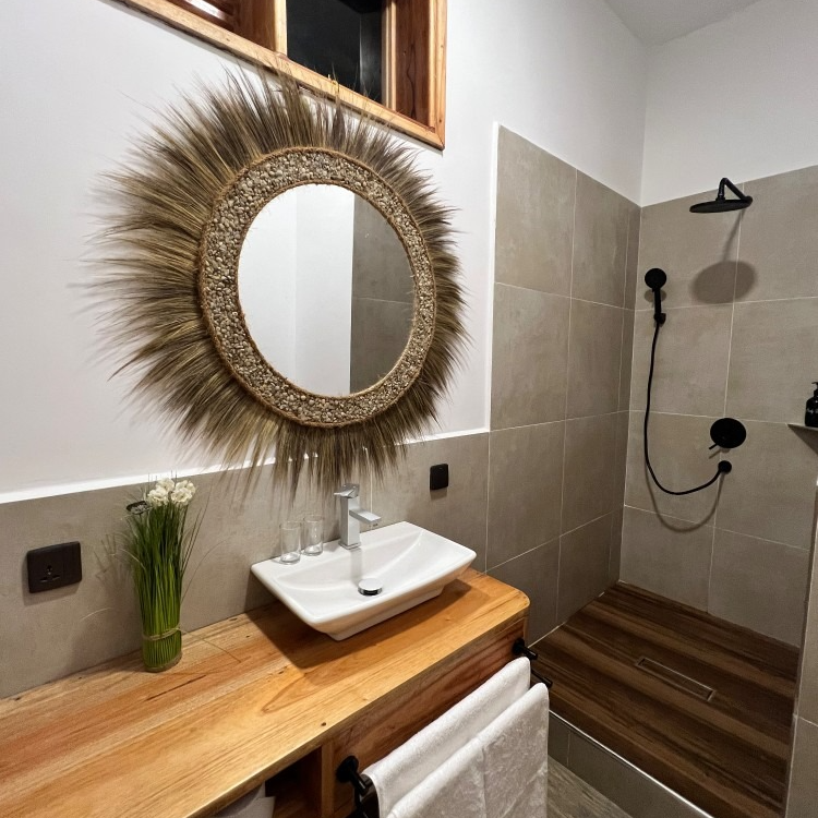 Modern ensuite bathroom with rain‑shower, plush towels and toiletries.