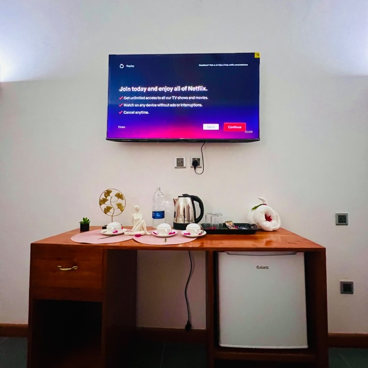 Inside: Smart TV, complimentary tea & coffee, secure in-room safe, and open‑style clothes rack.
