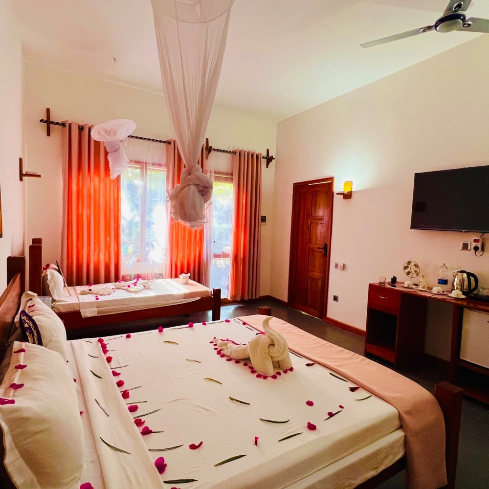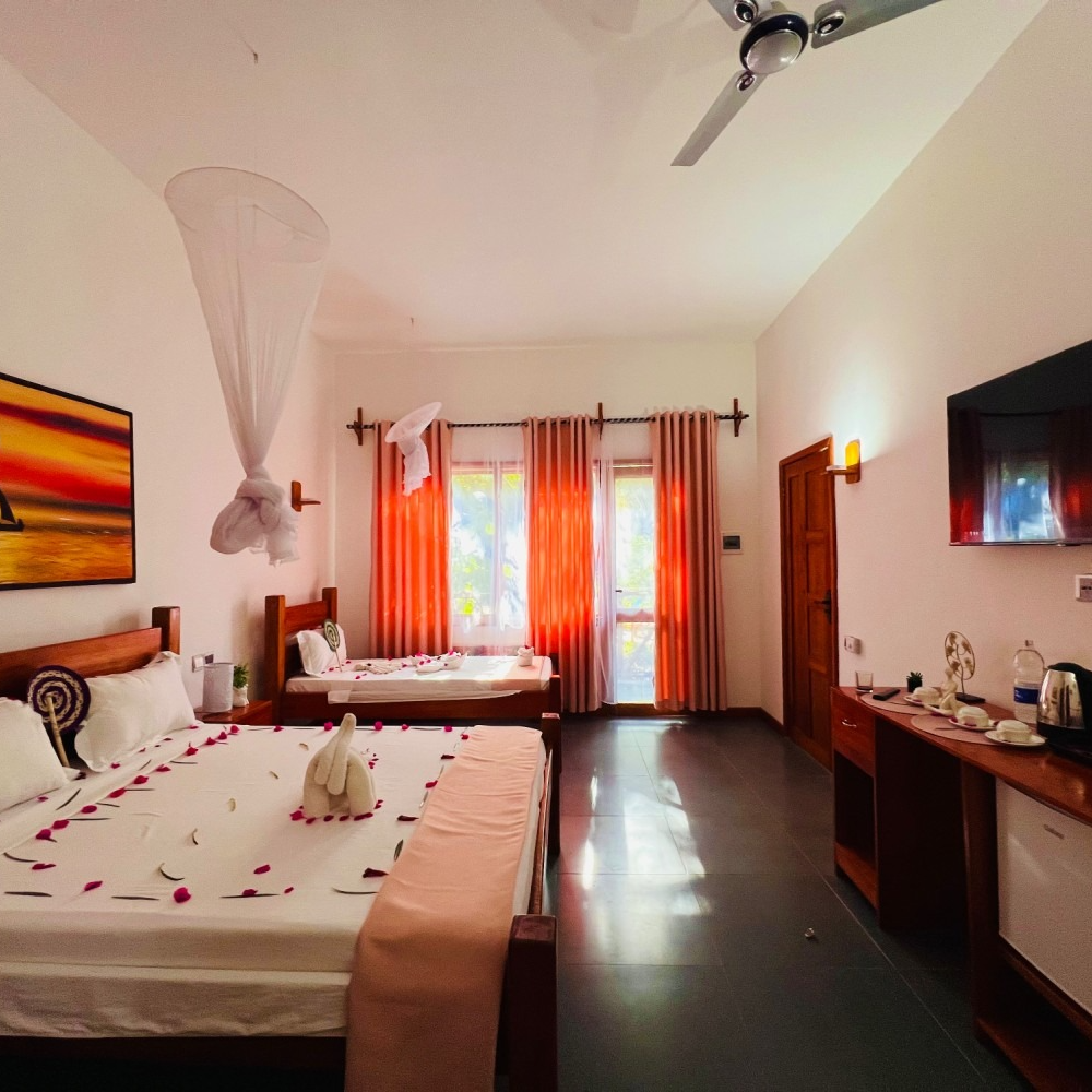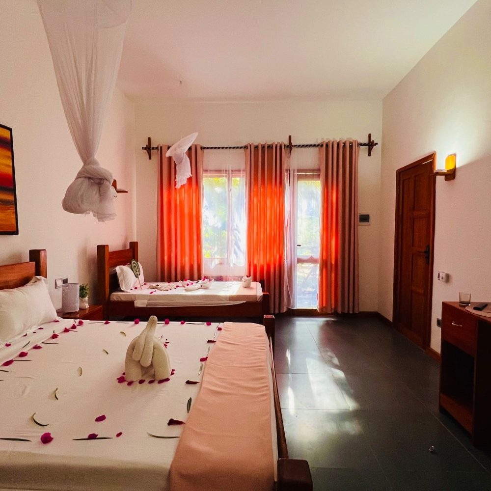 Triple Spacious 30 sqm room overlooking a lush tropical garden and sparkling pool.