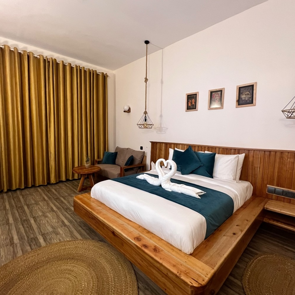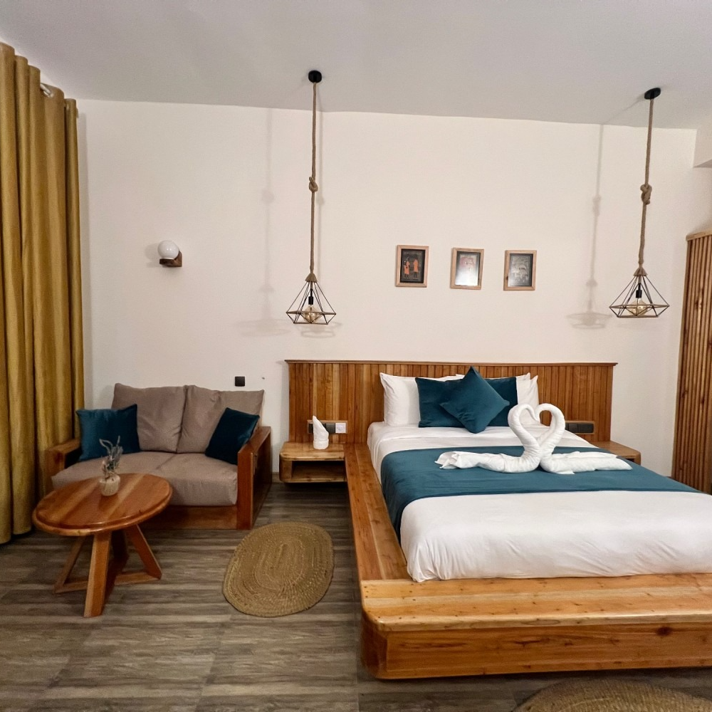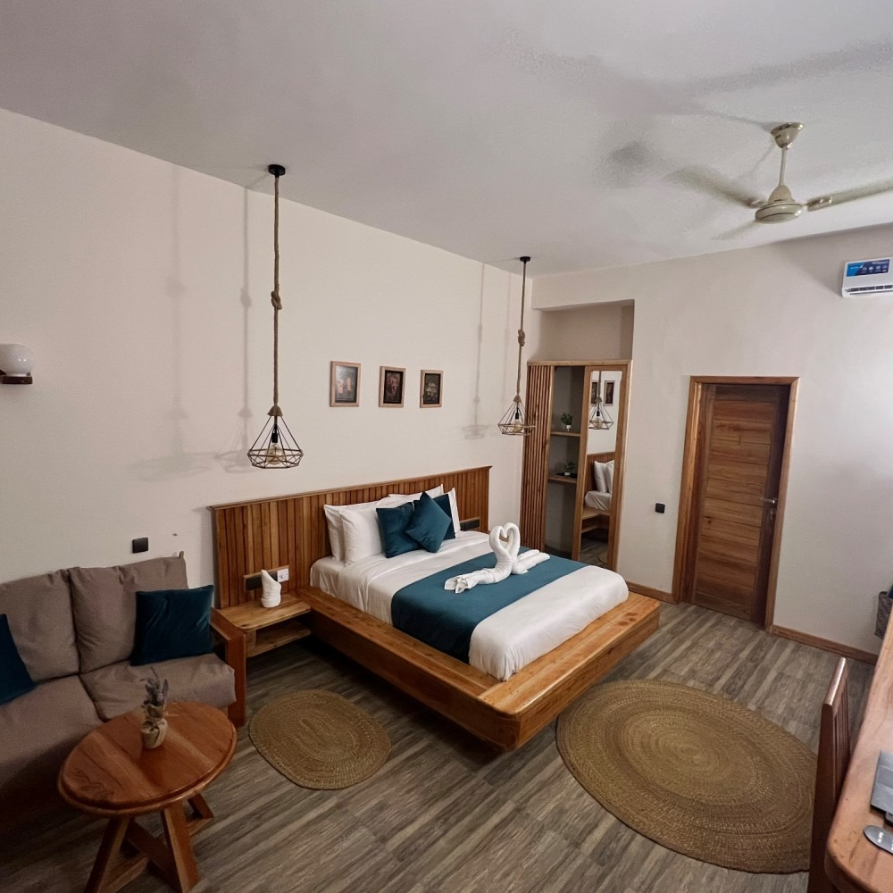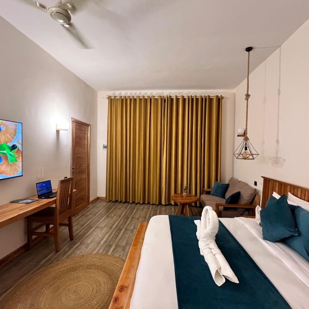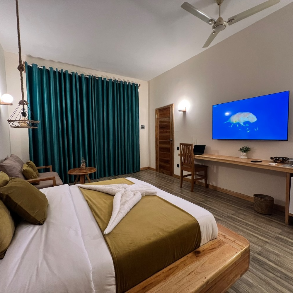 Spacious suite with plush contemporary décor, king‑size bed and separate lounge area. equipped with Large 60″ UHD Smart TV, Nespresso‑style coffee/tea station, minibar and electronic safe. Stylish bathroom, luxury toiletries, and a furnished balcony overlooking the tropical garden and pool.